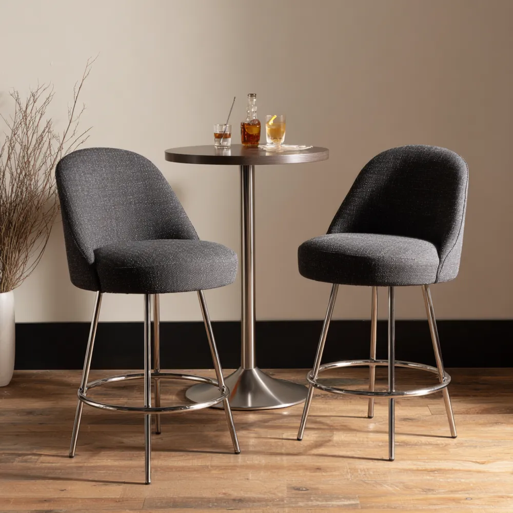 Descrizione del prodottoElegante set da bar perfetto per qualsiasi spazio moderno. Comprende un tavolo rotondo in metallo e due sedie in tessuto Grigio che offrono comfort e stile.