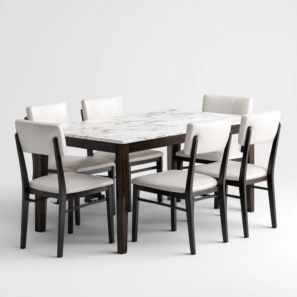 Materiale e lavorazioneIl tavolo presenta un piano in effetto marmo di colore Bianco, mentre le sedie sono in legno con seduta e schienale imbottiti in similpelle di alta qualità.