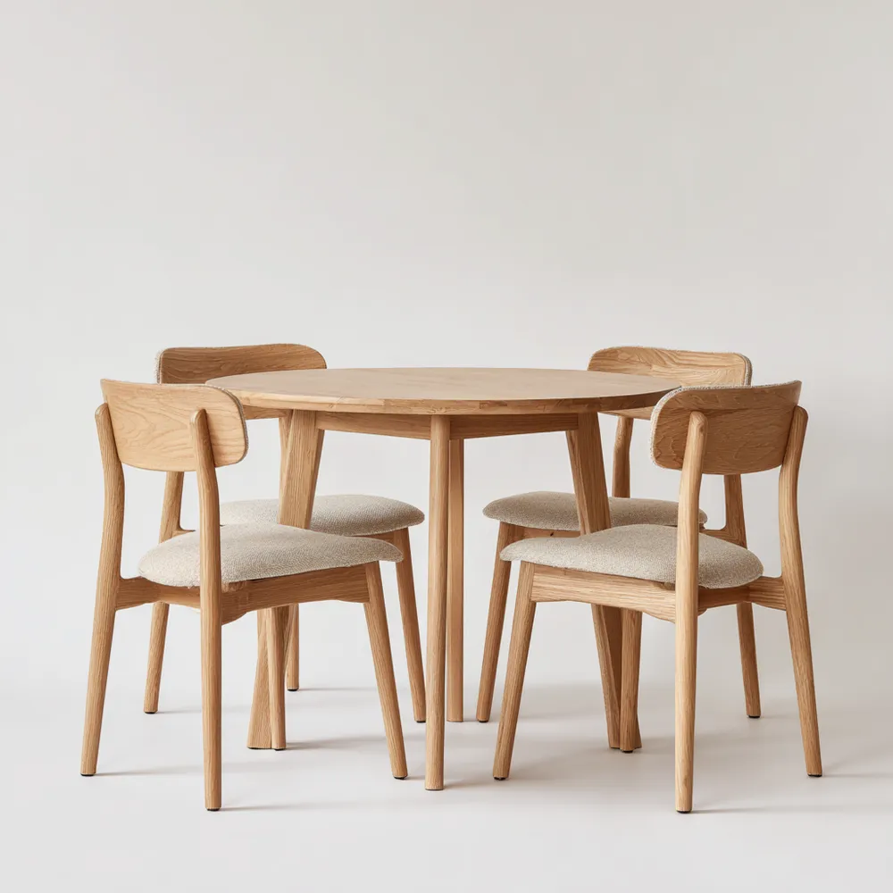 Descrizione del prodottoElegante set di tavolo rotondo e sedie da pranzo adatto a qualsiasi ambiente moderno. Realizzato in legno massello, offre resistenza e durata nel tempo.